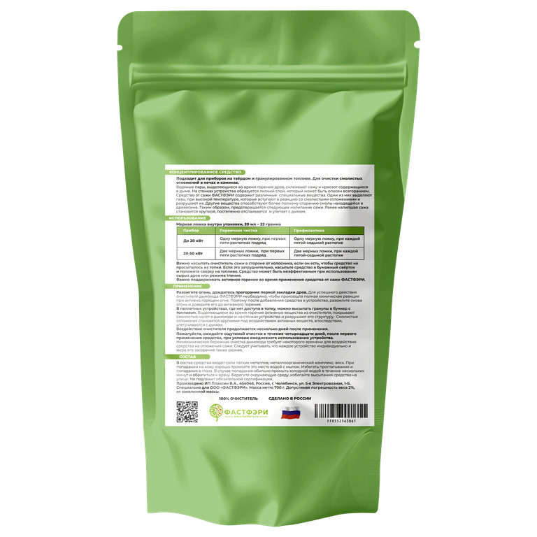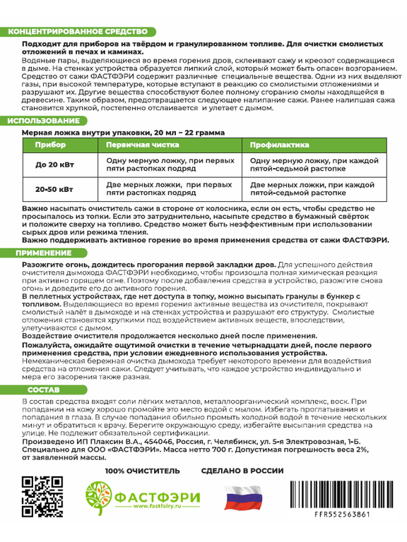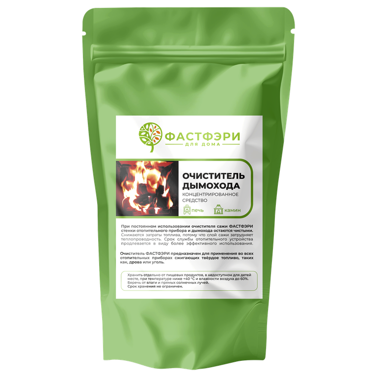 Хотите очистить дымоход меньше чем за пятьдесят рублей? Купите это средство от сажи. Его удобно хранить и им удобно пользоваться. Учитывая, что его хватит надолго стоимость одного применения меньше пятидесяти рублей. Вся этикетка, в том числе инструкция на русском языке, удобная и понятная.